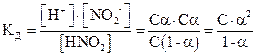 Равновесия в слабых электролитах подчиняются закону разведения Оствальда. Если общая молярная концентрация слабого электролита, например, слабой кислоты HNO2 равна С (моль/л), тогда концентрация ионов H+ и NO2- будет определяться выражением [H+] = [NO2-] = С·a (моль/л), а концентрация недиссоциированного электролита [HNO2] = (С-С·a). Тогда: