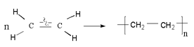 а) реакция полимеризации — процесс, в результате которого молекулы низкомолекулярного соединения (мономера) соединяются друг с другом при помощи ковалентных связей, образуя новое вещество (полимер), молекулярная масса которого в целое число раз больше, чем у мономера; полимеризация характерна, главным образом, для соединений с кратными (двойными или тройными) связями, например для этилена: