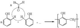 б) реакция поликонденсации — процесс образования полимера из низкомолекулярных соединений, содержащих две или несколько функциональных групп, сопровождающийся выделением за счет этих групп таких веществ как вода, аммиак, галогеноводород и т. п.; состав элементарного звена полимера в этом случае отличается от состава исходного мономера. Поликонденсацией получают фенолоформальдегидные смолы (ФФС) из формальдегида и фенола. Процесс сопровождается выделением воды: