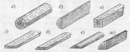 а - пиловочные строительные бревна; б - пластина; в - брус; г - доска обрезная; д - доска необрезная; е - горбыль; ж – четвертина