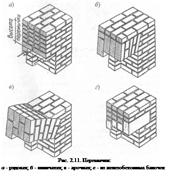 Перемычки (рис. 2.11) бывают рядовые, образуемые 5-6 рядами кладки, сложенной над проемом на растворе повышенной марки. Под нижний ряд кирпичей перемычки в слое раствора укладывают арматуру из пачечной или круглой стали диаметром 5-6 мм. Кроме рядовых, изредка применяют перемычки клинчатые и арочные, а чаще - сборные железобетонные из отдельных брусков, сечение которых стандартизировано.