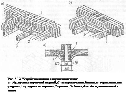 Во внутренних кирпичных стенах толщиной не менее 1,5 кирпича можно устраивать дымовые или вентиляционные каналы, которые делают путем оставления пустот в теле стены (рис. 2.12, а) или путем закладки в стену керамических блоков (рис. 2.12, б) или асбестоцементных труб. Если с дымовым каналом соприкасаются сгораемые конструкции, то их отодвигают от полости канала не менее чем на 250 мм путем устройства разделок, показанных на рис. 2.12, в.