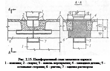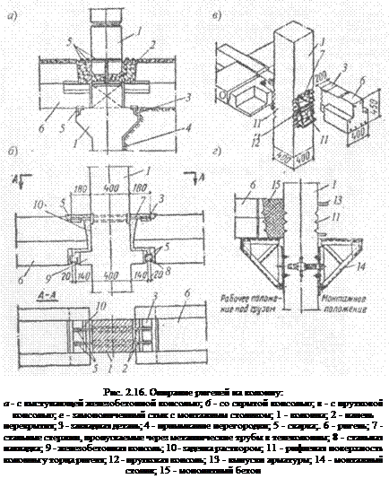Соединение ригелей с колоннами может быть осуществлено различными способами: с опиранием на консоли колонн, в виде платформенного стыка, гнездовым стыком, монолитным стыком или с опиранием на вынесенные консоли стоек.
