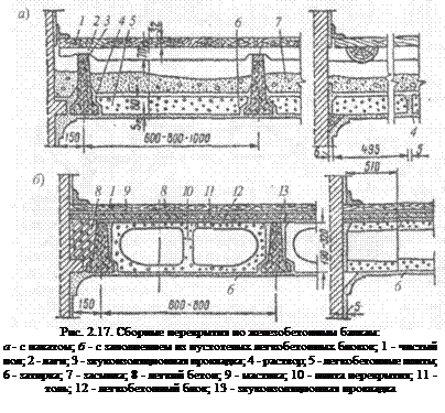 Железобетонные перекрытия. Главнейшими преимуществами железобетонных перекрытий являются их долговечность, прочность и несгораемость. Железобетонные перекрытия разделяют на монолитные, т.е. изготовляемые на месте строительства, и сборные - из элементов заводского изготовления (рис. 2.17).