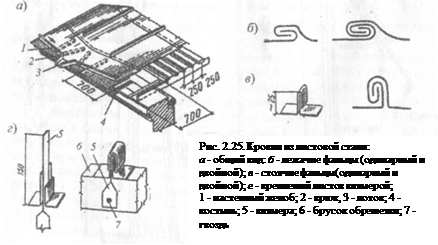 Крепление листов к обрешетке клямерами, узкими полосками кровельной стали, сопряжение листов между собой фальцами и другими деталями кровли показаны на рис.