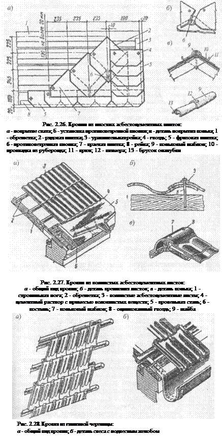 Кровли из асбестоцементных плоских плиток (рис. 2.26) имеют малый вес, долговечны, невозгораемые, требуют малых эксплуатационных расходов, однако им приходится придавать большой уклон (до 50%). Кроме того, плоские плитки обладают довольно большой хрупкостью. Конек и ребра перекрывают особыми плитками - коньковыми.