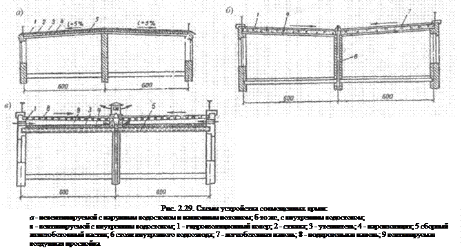 Совмещенные крыши. При совмещенных крышах, которым придается уклон 1:20, в верхнем этаже потолок устраивают также наклонным. Кровлю делают четырехслойной рубероидной или из рулонных синтетических материалов. Возможно вовсе отказаться от устройства кровли, производя лишь надежную забелку швов между панелями и окраску всей поверхности крыши специальными составами. Водоотвод с совмещенных крыш предпочтительно осуществлять по внутренним водостокам за исключением южных районов, где, вследствие исключения возможности образования наледей, можно устраивать организованный наружный водоотвод.