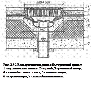 Водосток при плоских крышах чаще всего делают внутренним. Полы плоских крыш устраивают из железобетонных плит, укладываемых по | дренирующему слою из крупного песка или мелкого гравия, отводящему воду к воронкам внутренних водостоков. Конструкция водоприемной воронки показана на рис. 2.30.