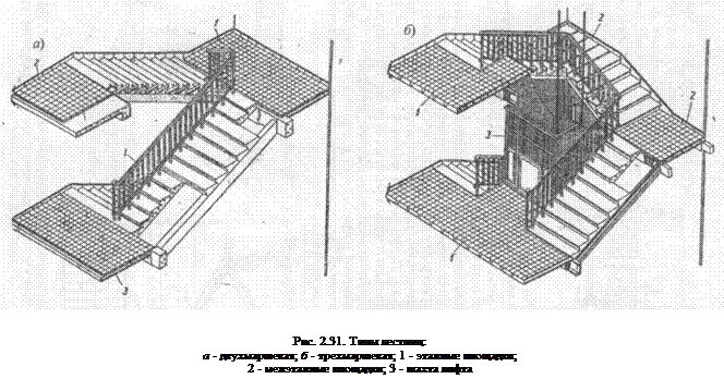При трехмаршевой лестнице (рис. 2.31, б) между маршами удобно располагать шахты пассажирского лифта. В общественных зданиях, кроме обычных двух- и трехмаршевых лестниц, применяются лестницы более сложных форм.
