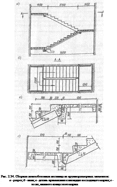На рис. 2.34 показаны разрез, план и детали основных узлов лестницы, собираемой из крупноразмерных элементов в виде маршей и площадок с чистыми бетонными поверхностями. В этом случае лестница состоит из трех основных элементов: марша, этажной и междуэтажной площадок. Марши своими концами опираются на полки, сделанные в площадочных балках. Зазор между маршем и площадкой заполняется цементным раствором. Элементы площадок опираются на боковые стены лестничной клетки.