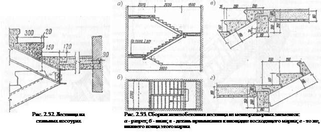 На рис. 2.33 показаны разрез, план и детали основных узлов лестницы из мелкоразмерных элементов для двухэтажного дома. Лестница имеет железобетонные косоуры прямоугольного сечения. На концах косоуров имеются шипы, вводимые при сборке лестницы в гнезда, сделанные в площадочных балках. После укладки косоуров зазоры между шипом и стенками гнезда заполняют мелкозернистым бетоном. На косоуры укладывают ступени на цементном растворе. Площадки из ребристых железобетонных плит укладывают ребрами вверх и концами опирают на боковые стены лестничной клетки. По площадочным плитам укладывают шлакобетон и делают тот или иной чистый пол.