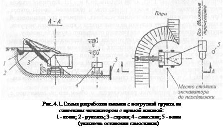 Экскаватор с прямой лопатой (рис. 4.1) применяют для разработки широких выемок в грунтах нормальной влажности. Экскаватор перемещается по дну выемки, копает «от себя» снизу вверх с погрузкой разрабатываемого грунта на транспортные средства- автосамосвалы, железнодорожные вагоны, подаваемые в радиус действия стрелы экскаватора.