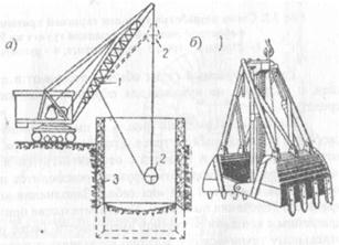 | Рис. 4.4. Разработка грунта экскаватором с грейферным ковшом: а - схема работы; б - грейферный ковш в раскрытом виде; 1 - стрела; 2 - ковш в закрытом виде; 3 - стенка опускного колодца |