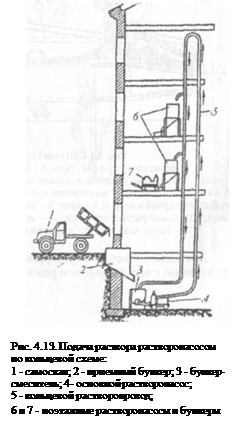 Штукатурный раствор подают на этажи здания по кольцевому растворопроводу, составленному из металлических труб диаметром не менее 50 мм (рис. 4.13). Раствор движется непрерывно от насоса по подающему и обратному стоякам, располагаемым обычно в лестничной клетке. На обратном стояке в каждом этаже ставят трехходовые краны, через которые раствор поступает в раздаточные или в загрузочные бункеры поэтажных растворонасосов. Основной растворонасос работает непрерывно, возвращая излишки раствора в бункер-смеситель. На рис. 4.13 показан растворонасос с оборудованием, расположенный в подвале дома, но на практике чаще у дома располагается штукатурная станция, а в остальном принцип работы всей схемы подачи раствора одинаков.