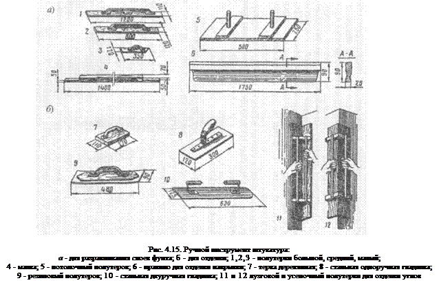 Для малых объемов штукатурных работ оштукатуривание производится вручную с использованием различных инструментов (рис. 4.15).