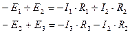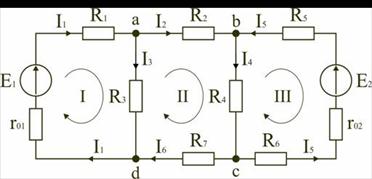 внешний контур схемы: E1 - E2 = I1(r01 + R1) + I2R2 - I5(r02 + R5 +R6) +I6R7.