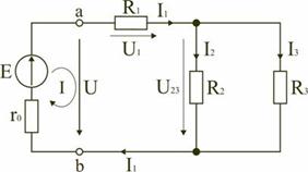Электрическая цепь, схема которой приведена на рис. 5, состоит из одного источника питания, имеющего ЭДС E и внутреннее сопротивление r0, и резисторов R1, R2, R3, подключенных к источнику по смешанной схеме. Операции расчета такой схемы рекомендуется производить в определенной последовательности.