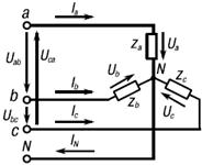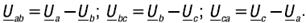 Из рисунке 6 видно, что при соединении звездой фазные напряжения приемника Ua, Ub и Uc не равны линейным напряжениям Uab, Ubc и Uca. Применяя второй закон Кирхгофа и к контурам aNba, bNcb и cNac, можно получить следующие соотношения между линейными и фазными напряжениями: