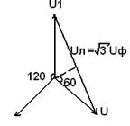 С помощью векторной диаграммы, показывающей систему трехфазного тока, легко установить, что соотношение между фазным и линейным напряжениями будет: Uл = 2(Uф sin60о) = √3 Uф.