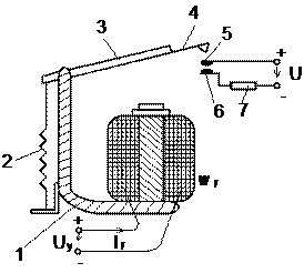 На рисунке показано устройство простейшего электромагнитного реле клапанного типа. При определенной магнитодвижущей силе (МДС) в цепи управления возникающая сила F притяжения якоря З к ярму 1 превышает силу противодействующей пружины 2. Воздушный зазор уменьшается. Клапан 4 нажимает на подвижный контакт 5 и прижимает его с силой F к неподвижному контакту 6. Управляемая цепь замыкается. Исполнительный элемент 7 производит требуемое действие.