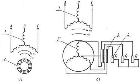 а) асинхронный двигатель с короткозамкнутым ротором; 6) асинхронный двигатель с фазным ротором; 1 — обмотки статора, 2 — ротор с короткозамкнутыми стержнями, 2 — обмотки фазного ротора, 3 — контактные кольца, 4— сопротивления в цепи фазного ротора.