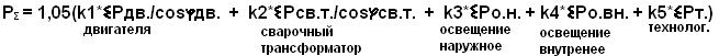 Т. е. суммированием мощностей используемых на площадке электродвигателей, сварочных трансформаторов, ламп освещения и технологических потребителей с учетом одновременности их работы коэффициентами, соответственно К1,К2,К3,К4,К5. Значения коэффициентов может составлять 0,4…0,9. При этом меньшие значения коэффициентов будут при большом количестве одноименных потребителей.