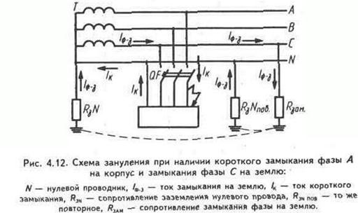 Заземление нейтрали источника тока имеет целью понизить напряжение на корпусах оборудования и на нулевом проводе, с которым эти корпуса соединены, до безопасного значения при замыкании фазного проводника на землю, при этом создается путь для тока Iф-з (рис. 4.12).