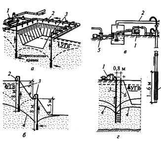 а - котлован с легкими иглофильтрами в один ярус; б - то же в два яруса; в, д - эжекторная иглофильтровая установка и фильтровое звено; г - схема электроосушения; 1 - рабочий насос; 2 - водоотводный коллектор; 3 - иглофильтр; 4 - уровень грунтовых вод после осушения; 5 - низконапорный насос; 6 - стальной стержень (анод); УГВ - уровень грунтовых вод.