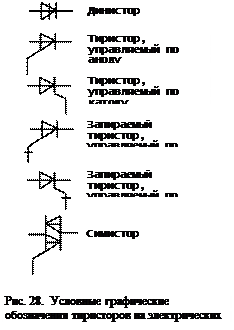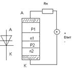 Тиристором называют полупроводниковый прибор с тремя последовательно включенными p-n переходами. Тиристоры с двумя электродами (рис. 26) называют динисторами-это неуправляемые тиристоры, с тремя электродами - тринисторы - это управляемые тиристоры.