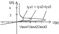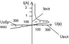 Если к тиристору приложить обратное напряжение, то он ведет себя как обычный диод - закрыт. При прямом включении тиристоров они остаются также закрытыми, пока напряжение между анодом и катодом не достигнет величины Uвкл. После этого тиристоры резко переходят в открытое состояние и ведут себя как обычные силовые диоды в прямом включении, пока ток через них не снизится до величины Iвыкл. Как только это произойдет, диод вновь переходит в закрытое состояние. У динисторов невозможно управлять величиной Uвкл, а у тринисторов величина Uвкл зависит от величины тока управляющего электрода: Uвкл = f (Iуэ) и при достаточно больших токах Iуэ вольтамперная характеристика тринистора вырождается в прямую ветвь характеристики обычного диода. Управление тринистором осуществляется лишь при его отпирании, а затем он становится неуправляемым.