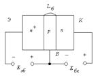 В реальных конструкциях транзисторов эмиттер имеет большую степень легирования и меньшую площадь. На рис. 29- б) эмиттер с электронной электропроводностью, причём сильной, показан со знаком плюс. Взаимодействие p-n-переходов обеспечивается выбором толщины базы. База должна быть достаточно тонкой /толщина базы должна быть много меньше длины диффузии неосновных носителей в базе/.