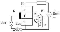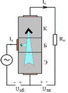 Так как сопротивление обратно смещенного коллекторного p-n перехода очень велико (сотни кОм) для основных носителей, то включение Rн величиной единицы кОм в коллекторную цепь (рис. 30) мало повлияет на общее сопротивление цепи. Тогда очевидно, что, управляя на входе малой мощностью Pвх=Uбэ*Iбэ можно получить пропорциональный цикл в выходной цепи значительно большей мощности: Pвых=Iк