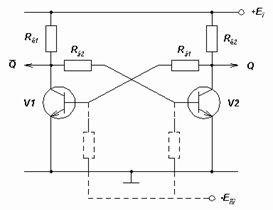 Состоит из двух транзисторных ключей, охваченных перекрестной положительной обратной связью (ОС).