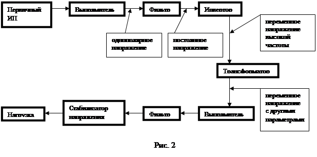 Данная схема (содержащая в своем составе все перечисленные функциональные узлы), является более сложной, но на практике, вследствие меньших габаритов за счет использования высокочастотного трансформатора вместо низкочастотного, находит все большее применение.