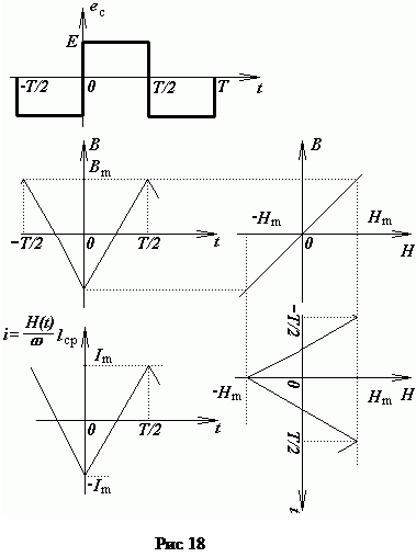 Ниже рассматривается воздействие напряжения на дроссель с идеализированной зависимостью B=B(H) (рис 18). Тогда при воздействии прямоугольного напряжения: