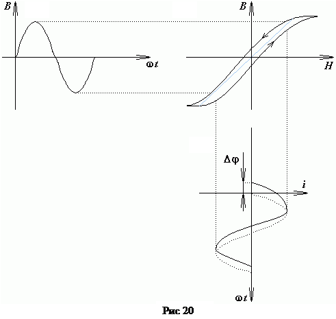 В случае гистерезиса сдвиг по фазе между током и входным напряжением отличен от p/2 на некоторый угол Dj, рис. 20.