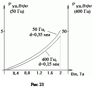 Как правило, их приводят в виде зависимостей удельных потерь Pуд (Вт/кг) от Bm для конкретного материала сердечника, данной частоты f и данной толщины листового материала d (рис. 21).