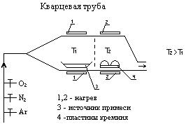 2) происходит нагрев обеих секций: в первой зоне происходит испарение примеси (аргон захватывает атомы примеси и переносит их в зону пластин), затем происходит осаждение на пластине и диффузия.