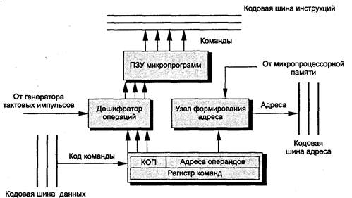 □ интерфейсную, содержащую адресные регистры МПП; блок регистров команд — регистры памяти для хранения кодов команд, выполняемых в ближайшие такты; схемы управления шиной и портами.