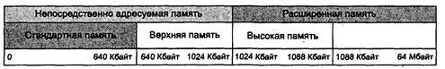 Современные ПК (кроме простейших бытовых компьютеров) имеют основную память, емкостью существенно больше 1 Мбайт. Но память до 1 Мбайт является еще одним важным структурным компонентом ОП — назовем ее непосредственно адресуемой памятью (справедливо полностью только для реального режима). Для адресации 1 Мбайт = 220 = 1 048 576 ячеек непосредственно адресуемой памяти необходим 20-разрядный код, получаемый в ПК при помощи специальной структуризации адресов ячеек ОП.