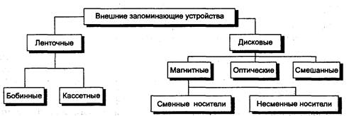 Устройства внешней памяти, или, иначе, внешние запоминающие устройства (ВЗУ), весьма разнообразны. Их можно классифицировать по целому ряду признаков: по виду носителя, по типу конструкции, по принципу записи и считывания информации, по методу доступа и т. д. При этом под носителем понимается материальный объект, способный хранить информацию.