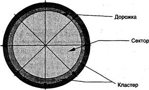 Магнитные диски (МД) относятся к магнитным машинным носителям информации. В качестве запоминающей среды у них используются магнитные материалы со специальным свойством (прямоугольная петля гистерезиса), позволяющим фиксировать два направления намагниченности, которым ставятся в соответствие двоичные цифры: 0 и 1. На рис. 6.6 показана логическая структура МД.