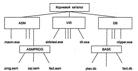 Файловая система обеспечивает формирование иерархической многоуровневой файловой структуры, в корне которой находится корневой каталог, а узлами и листьями являются каталоги и файлы. Рассмотрим пример дерева каталогов (рис. 6.7). Здесь в состав корневого каталога включены подкаталоги ASM, VIR и DB, содержащие файлы компиляторов, программ антивирусной защиты и данных. В свою очередь, подкаталог ASM содержит компилятор языка ассемблер masm.exe и подкаталог ASMPROG, в котором находятся файлы с программами на этом языке. Подкаталог VIR содержит файлы aidstest.exe и dir.exe. В подкаталоге DB расположены файлы базы данных.