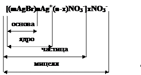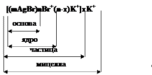 На поверхности основы из дисперсионной среды необменно адсорбируются ионы того или иного знака. Совокупность основы с адсорбированными на поверхности ионами называется ядром. Обычно адсорбируются ионы, в составе которых находятся элементы или атомные группировки, имеющиеся в веществе ядра частицы (правило Пескова-Фаянса). Например, при образовании золя бромистого серебра из раствора, содержащего небольшой избыток КВг частицы AgBr, адсорбируя преимущественно ионы Вг-, заряжаются отрицательно. При получении того же золя AgBr, но при условии избытка AgN03 в растворе, частицы AgBr заряжаются положительно вследствие адсорбции ионов Ag+ Ионы, адсорбирующиеся на поверхности основы и обусловливающие величину и знак электрического заряда частицы, называются потенциалопределяющими ионами.