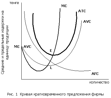 Предельные издержки равны средним издержкам (ATC) и (AVC), когда их величина минимальна. Восходящая часть МС, после пересечения кривой (AVC) средних переменных издержек, является ее кривой кратковременного предложения. Если цена (Р) будет ниже наинизшей точки (∙L) кривой AVC, фирма прекратит производство.