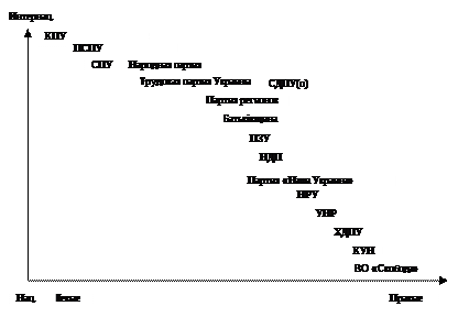 Как и в 90-е годы, наиболее влиятельные из множества партий, действующих в Украине наглядно представлены на ссхеме (см. рис. 9.1), где ось ординат указывает на степень приверженности принципам интернационализма или национализма, а ось абсцисс – на расположение партии в право-левом спектре. Конечно, схема приблизительная. Соотношения характеристик подвижны.