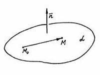 Для любой точки плоскости М(х, у, z) вектор М0М = { x - x0 , y - y0, z - z0) ортогонален вектору n, следовательно, их скалярное произведение равно нулю: