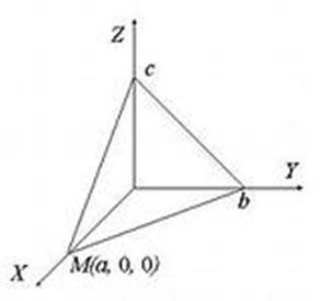 называемому уравнением плоскости в отрезках. Способ преобразования показан в разделе прямой на плоскости. Параметры а, b и с равны величинам отрезков, отсекаемых плоскостью на координатных осях.