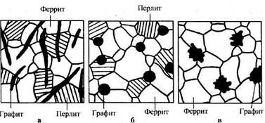 Рис. 14. Схематическое изображение структур чугунов: а - серого, б - высокопрочного, в - ковкого.