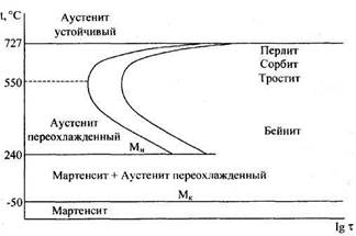 Рис 16. Диаграмма изотермического превращения аустенита эвтектоидной стали (схема).